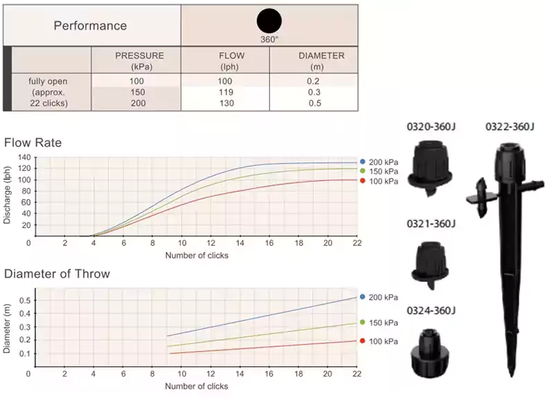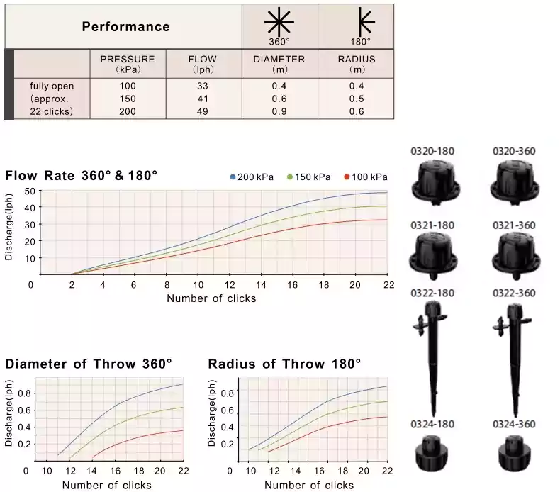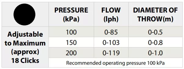 Rotation af Mini Bubbla-hætten tillader samtidig justering af flowhastighed og kastediameter. Denne Twista-sprøjte med justerbar flow er et ensartet paraplymønster, der forsigtigt påfører vand til plantens rodzone.