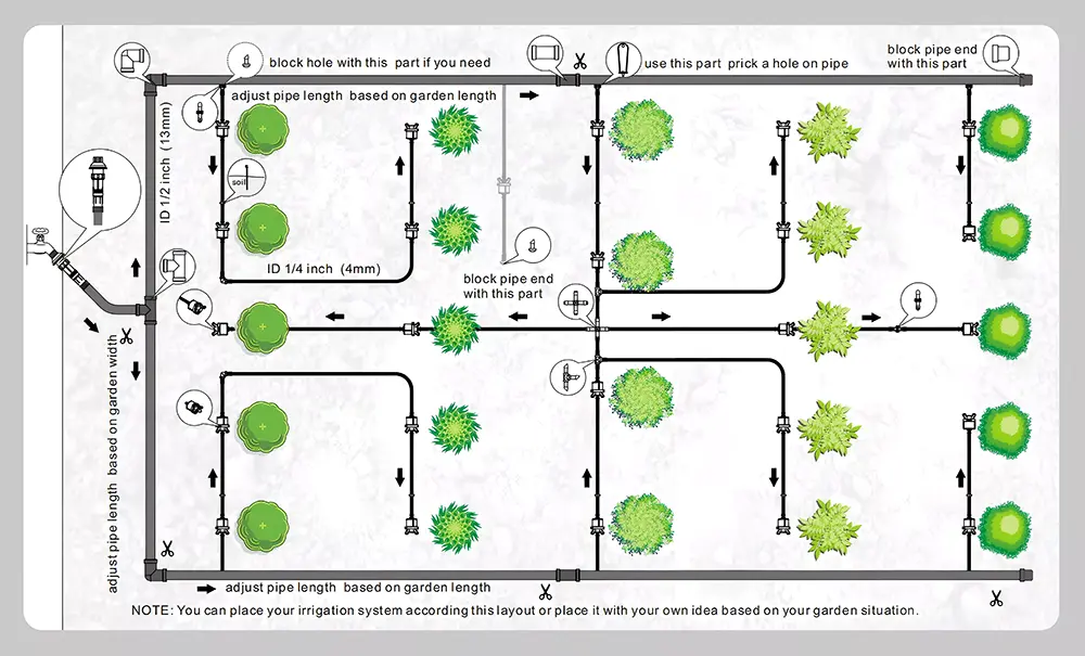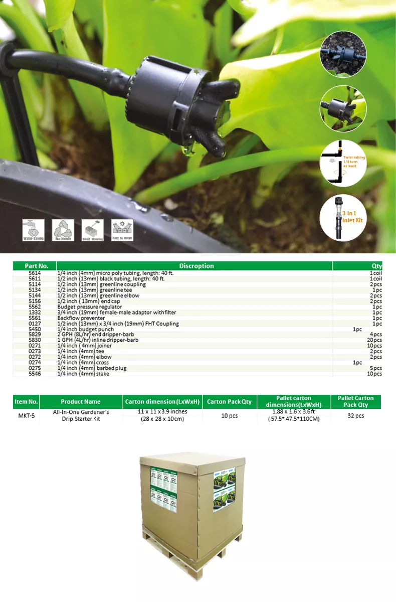 Alt-i-et drypstartersæt til gartnere hjælper dig med at bygge dit eget kunstvandingssystem, drypvandingssæt er en effektiv og vandbesparende løsning til landbrugs-, havebrugs- og havebrugsbehov. De leverer vand direkte til planterødderne, minimerer spild og maksimerer plantesundheden.