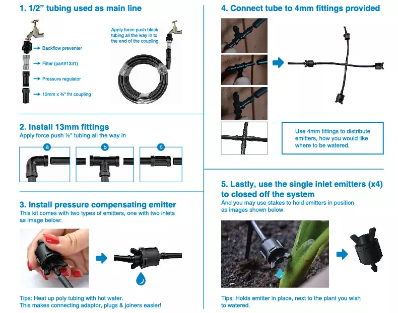Nem installation: Designet til gør-det-selv-opsætning med fleksible slanger, emittere og stik.
