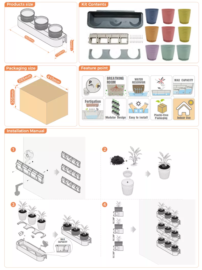 Du kan plante dine yndlingsplanter eller -grøntsager i urtepotterne. Vanding er også meget praktisk. Du skal blot tilføje vand eller næringsopløsning til den hængende potte til opbevaring af vand. Urtepotten har et udhulet design i bunden, som gør, at den kan absorbere vand bedre.
