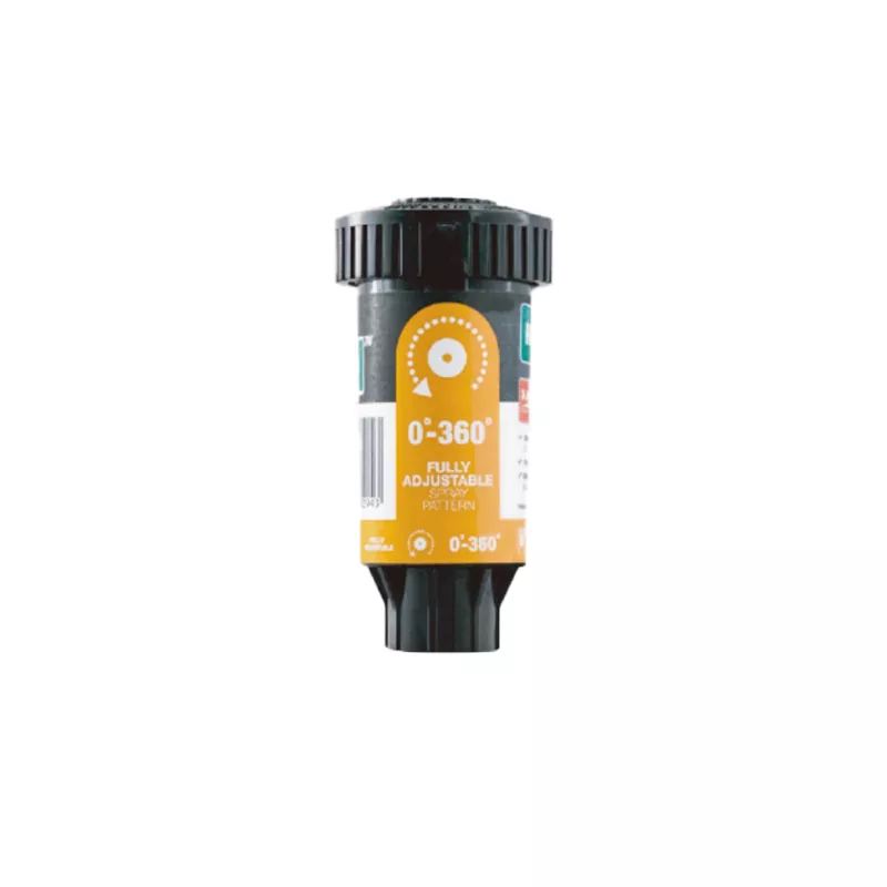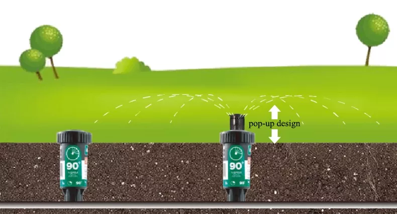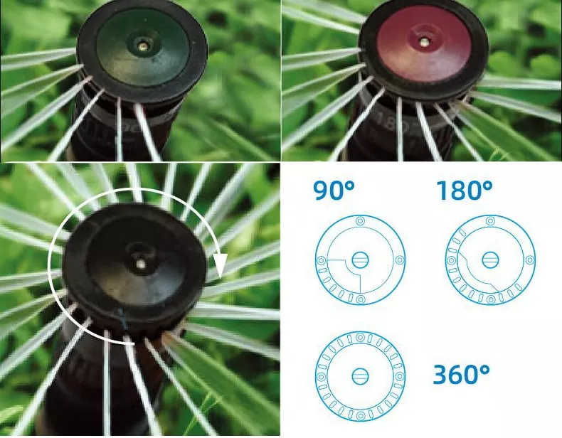 Tre roterende sprinklermuligheder: 90°、180°、360°Disse græsvandssprinklere tilbyder fremragende vindmodstand og bred dækning med en maksimal sprøjteafstand på op til 7,1 meter. De producerer en fin, tågelignende spray, hvilket gør dem ideelle til vanding af store græsplæner, haver og lignende områder.