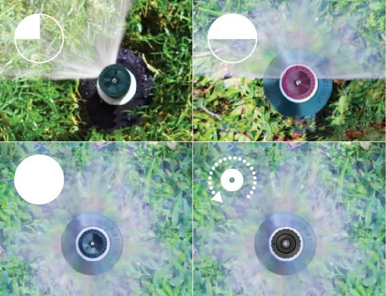 POP-UP-DYSERNE er velegnede til Pop-Up-sprinklere, ideelle til vanding af græsplæner og havebede. FUNKTIONER 1、Der er 90°, 180°, 270°, 360° og justerbare hoveder for flere valgmuligheder, den fuldt justerbare dyse sikrer, at alle sprøjtemønstre er dækket uden behov for at skifte dyse. Indikation på dyserne (Se nedenfor). 2、Accepterer RIANBIRD-kompatibel pop-up sprinkler. 3、 Kaster 3,8m radius.