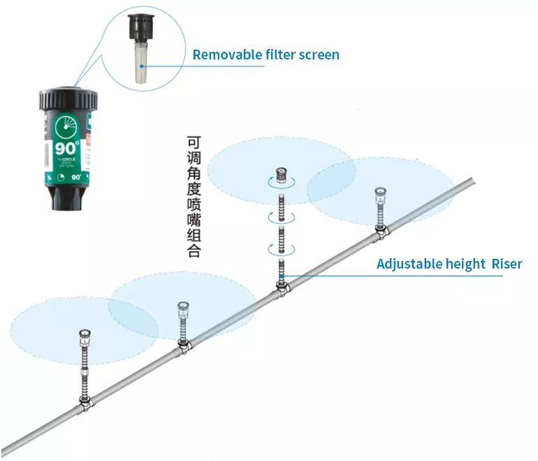MMIP underjordiske sprinkler har et udskifteligt dysedesign. Den universelle sprinklerbase giver brugerne mulighed for at vælge passende dyser i henhold til kravene fra forskellige steder. Den aftagelige filterskærm er nem at rengøre. Desuden kan den parres med stigrør og tilsvarende tilbehør for at skabe sprinkleranlæg i forskellige højder.