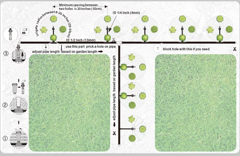 Dette sæt, der er let at installere, er perfekt til begyndere, ideelt til vanding af køkkenhaver, blomsterbede og græsplæner. Sættet indeholder to sprøjtedyser med forskellige sprøjtemønstre: