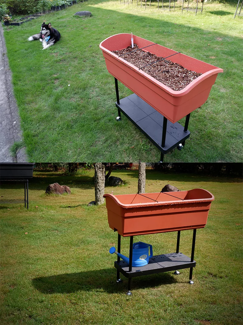 Denne mobile forhøjede haveseng er specielt designet til folk, der ikke kan bukke sig ned. Den bruger en jernramme til at hæve urtepotterne, så brugerne kan plante planter, mens de står. Den kommer også med en plastopbevaringsbakke, hvor haveredskaber kan opbevares, hvilket er meget brugervenligt for ældre.