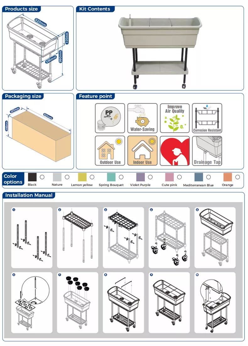 Mobile Elevated Garden Bed overholder de ergonomiske designprincipper, især at tage sig godt af de ældre, der har svært ved at sidde på hug på grund af mobilitetsproblemer. Med et enkeltlags opbevaringsstativ-design kan den opbevare alle slags værktøj og tilbehør, der er nødvendige til blomster- og plantedyrkning. Den er udstyret med universalhjul, som letter dens bevægelse i både indendørs og udendørs miljøer. Det kan godt opfylde behovene hos folk, der bor i byer, der elsker at plante. Det giver dig et fremragende miljø for plantedyrkning og hjælper dig med nemt at skabe din egen økologiske, grønne og sunde livsstil.