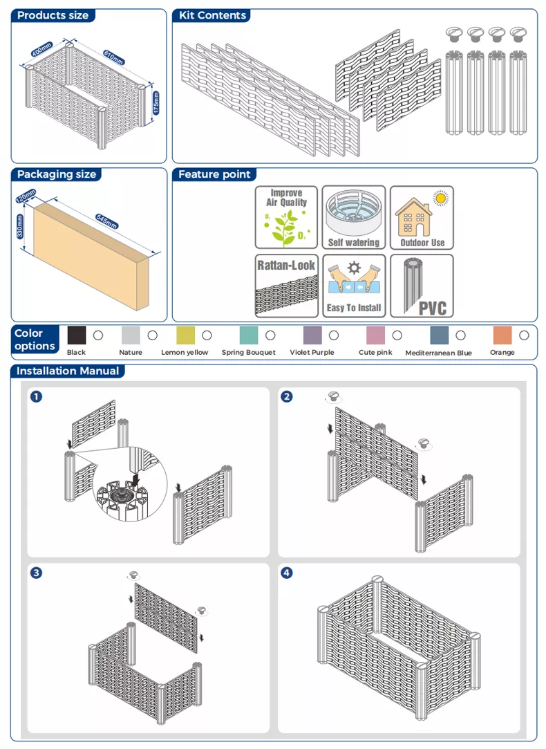 Hver rektangulær haveseng i immolrattan plastik kommer med en detaljeret illustreret monteringsvejledning, der tydeligt markerer installationstrinene og forholdsreglerne for hver komponent. Hvis du støder på spørgsmål under monteringsprocessen, kan du til enhver tid kontakte os via online kundeservice, officiel hotline eller andre kanaler, vi vil give en-til-en video- eller tekstvejledning for at sikre, at du gennemfører installationen problemfrit.