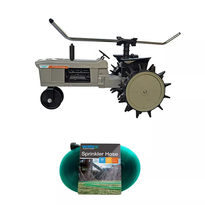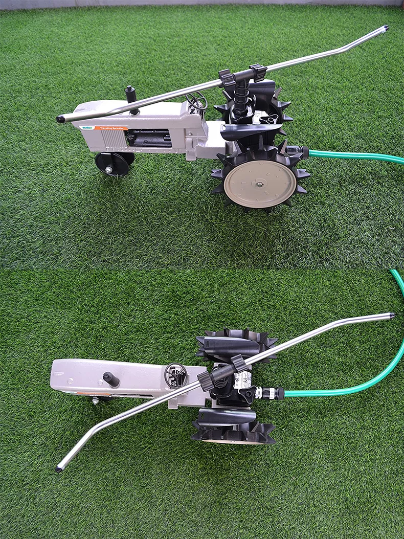 Velkommen til at vælge den rejsesprinkler fra Watex. Dette produkt har et unikt traktor-design og er en selvkørende vandvogn, der bruger vandtryk til at drive sin bevægelse, hvilket muliggør effektiv græsplænevanding.